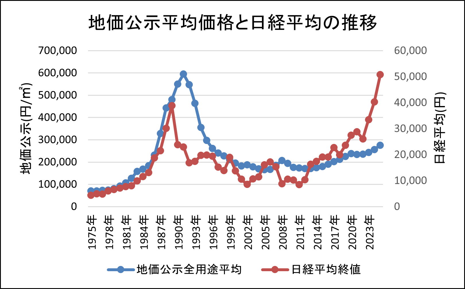 以下に、地価公示の平均価格と日経平均価格の値動きの長期データを示します。
